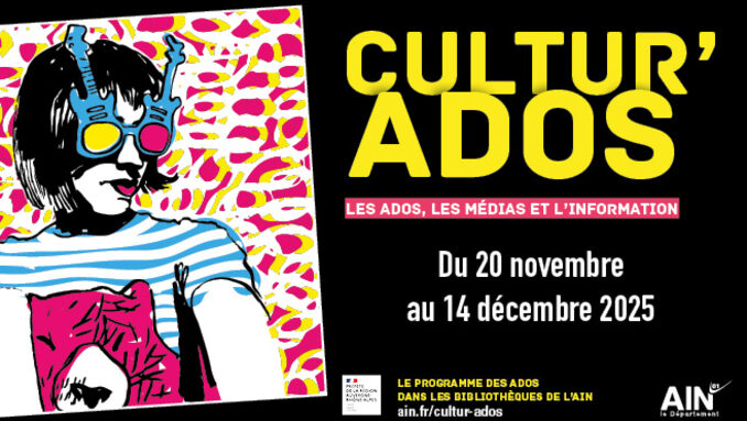 Par Direction des Collèges, publié le mercredi 29 octobre 2025 16:27 - Mis à jour le mercredi 29 octobre 2025 16:35Offre de la Bibliothèque départementale de l'Ain : CULTUR’ADOS, le programme des Ados dans les bibliothèques de l’Ain revient en 2025 ! du 20 novembre au 14 décembre 2025 -