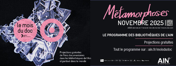 Ce programme coordonné par la Bibliothèque départementale de l’Ain, en partenariat avec l’association Images en bibliothèque, est proposé dans le cadre du Mois du film documentaire 2025.